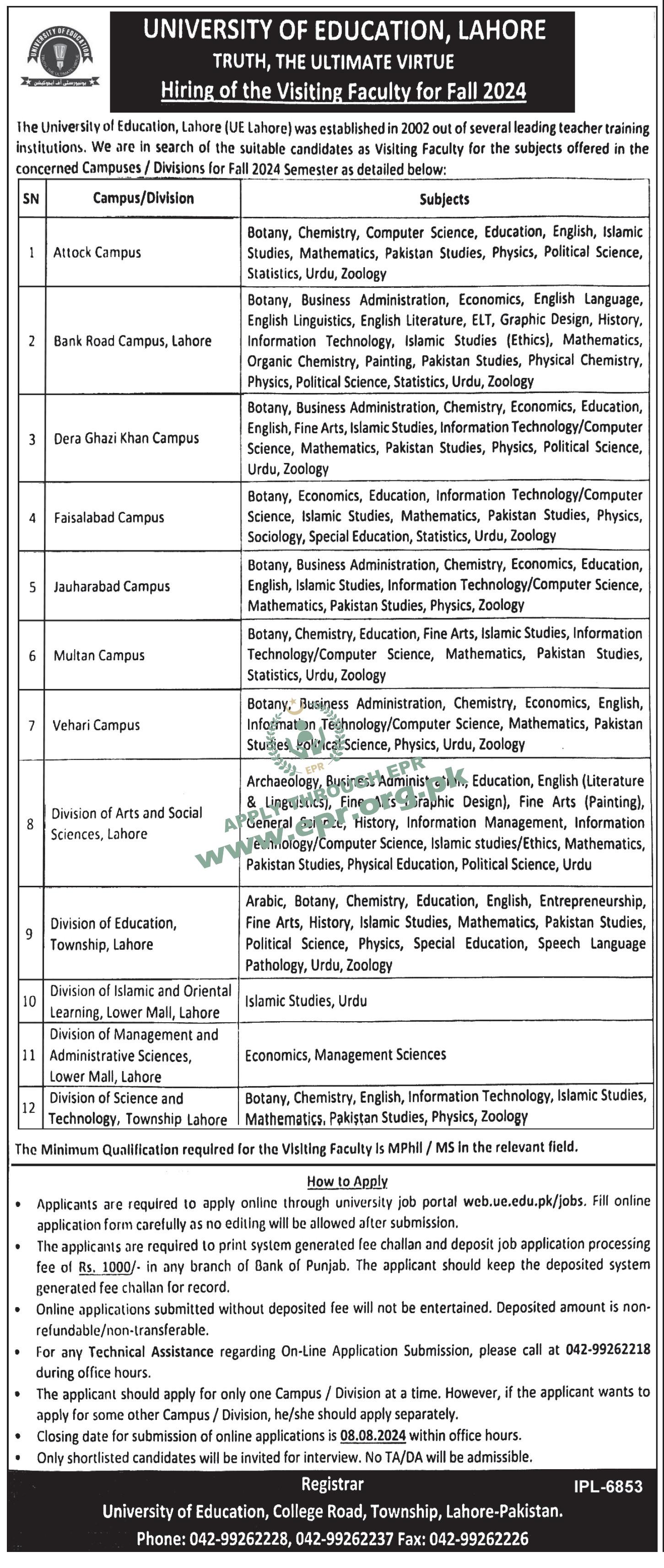 Govt. Dept : UNIVERSITY OF EDUCATION LAHORE