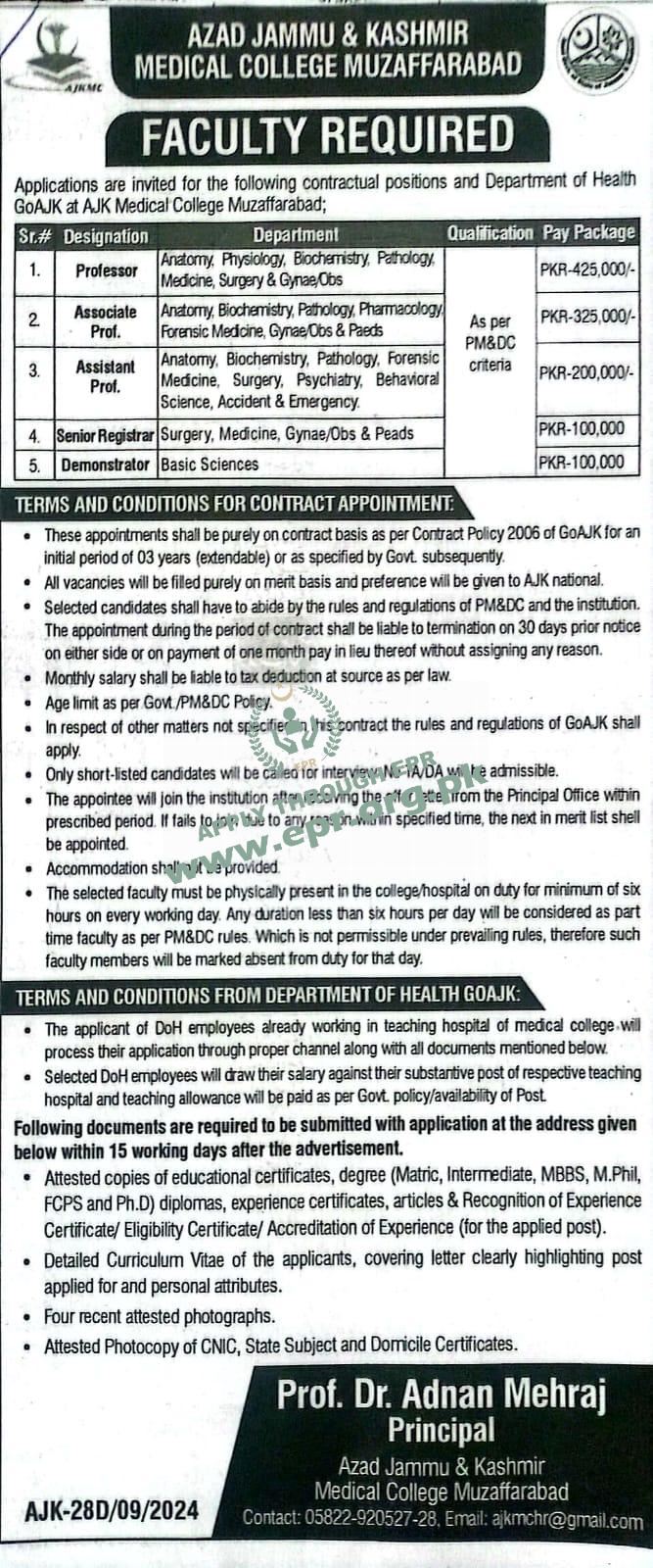 MBBS or equivalent medical qualifications recognised / registered by the PM&DC, Level II a & b and Level III Postgraduate degree or diploma in education related field recognized by HEC or PM&DC, 2 years teaching experience as Lecturer/ Demonstrator /instructor before or after Level-II b. No experience is required for Level-III post graduation who can be appointed directly as assistant professor.No publication is required, but may receive preference in selection.