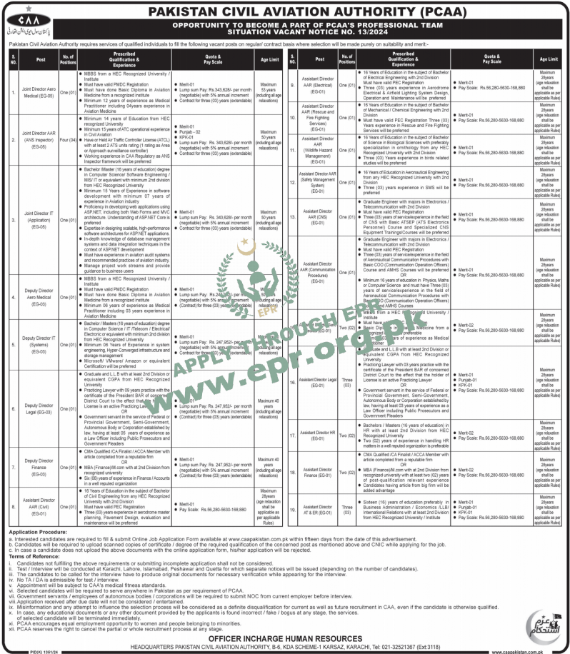 Graduate Engineer with majors in Electronics / Telecommunication with 2nd Division Must have valid PEC Registration Three (03) years of service/experience in the field of Aeronautical Communication Procedures with Basic COO (Communication Operation Officers) Course and AMHS Courses will be preferred OR Minimum 16 years of education in Physics, Maths or Computer Science and must have Three (03) years of service/experience in the field of Aeronautical Communication Procedures with Basic COO (Communication Operation Officers) Course and AMHS Courses.