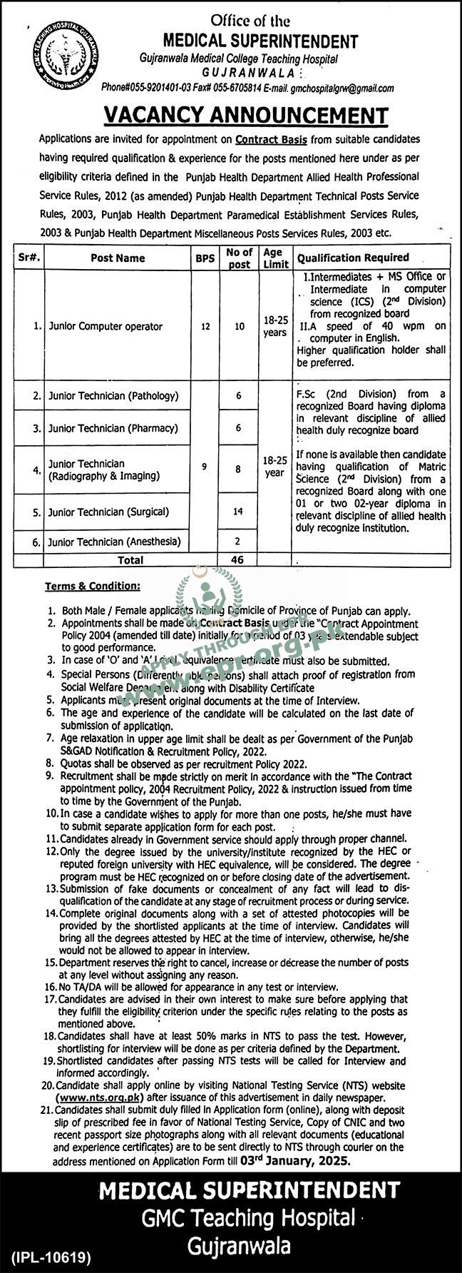 Govt. Dept : GUJRANWALA MEDICAL COLLEGE TEACHING HOSPITAL, GUJRANWALA