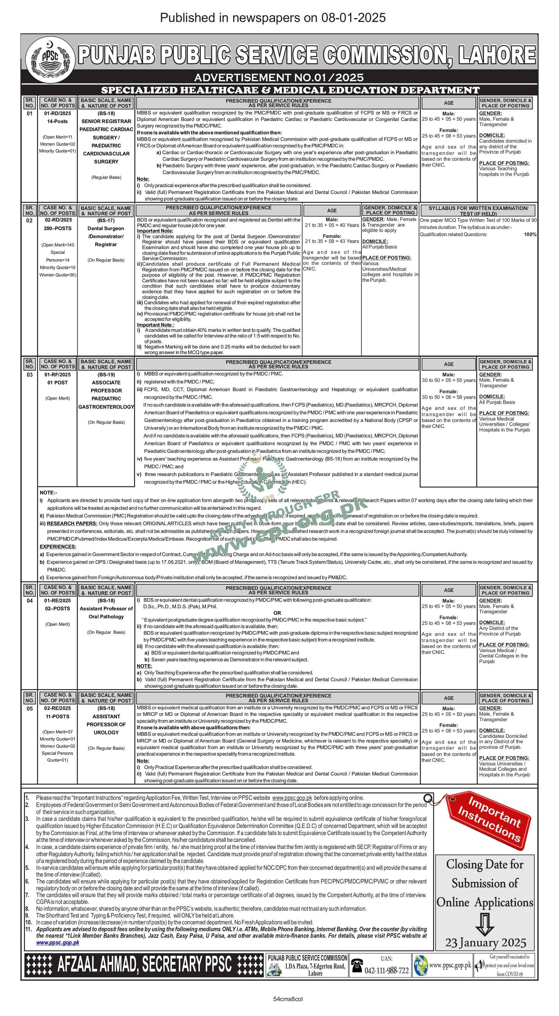 MBBS or equivalent qualification recognized by the PMC/PMDC with post-graduate qualification of FCPS or MS or FRCS or Diplomat American Board or equivalent qualification in Paediatric Cardiac or Paediatric Cardiovascular or Congenital Cardiac Surgery recognized by the PMDC/PMC. If none is available with the above mentioned qualification then: MBBS or equivalent qualification recognised by Pakistan Medical Commission with post-graduate qualification of FCPS or MS or FRCS or Diplomat of American Board or equivalent qualification recognised by the PMC/PMDC in: a) Cardiac or Cardiac-thoracic or Cardiovascular Surgery with one year's experience after post-graduation in Paediatric Cardiac Surgery or Paediatric Cardiovascular Surgery from an institution recognised by the PMC/PMDC. b) Paediatric Surgery with three years' experience, after post-graduation, in the Paediatric Cardiac Surgery or Paediatric Cardiovascular Surgery from an institution recognised by the PMC/PMDC.