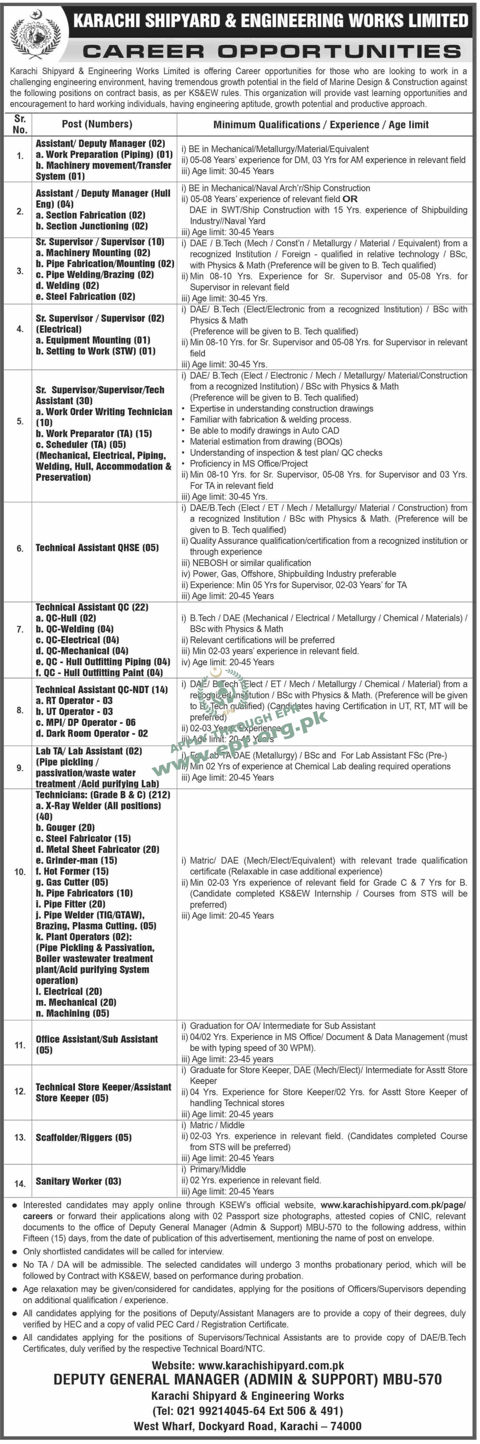 Matric/ DAE (Mech/Elect/Equivalent) with relevant trade qualification certificate (Relaxable in case additional experience) Min 02-03 Yrs experience of relevant field for Grade C & 7 Yrs for B. (Candidate completed KS&EW Internship / Courses from STS will be preferred)
