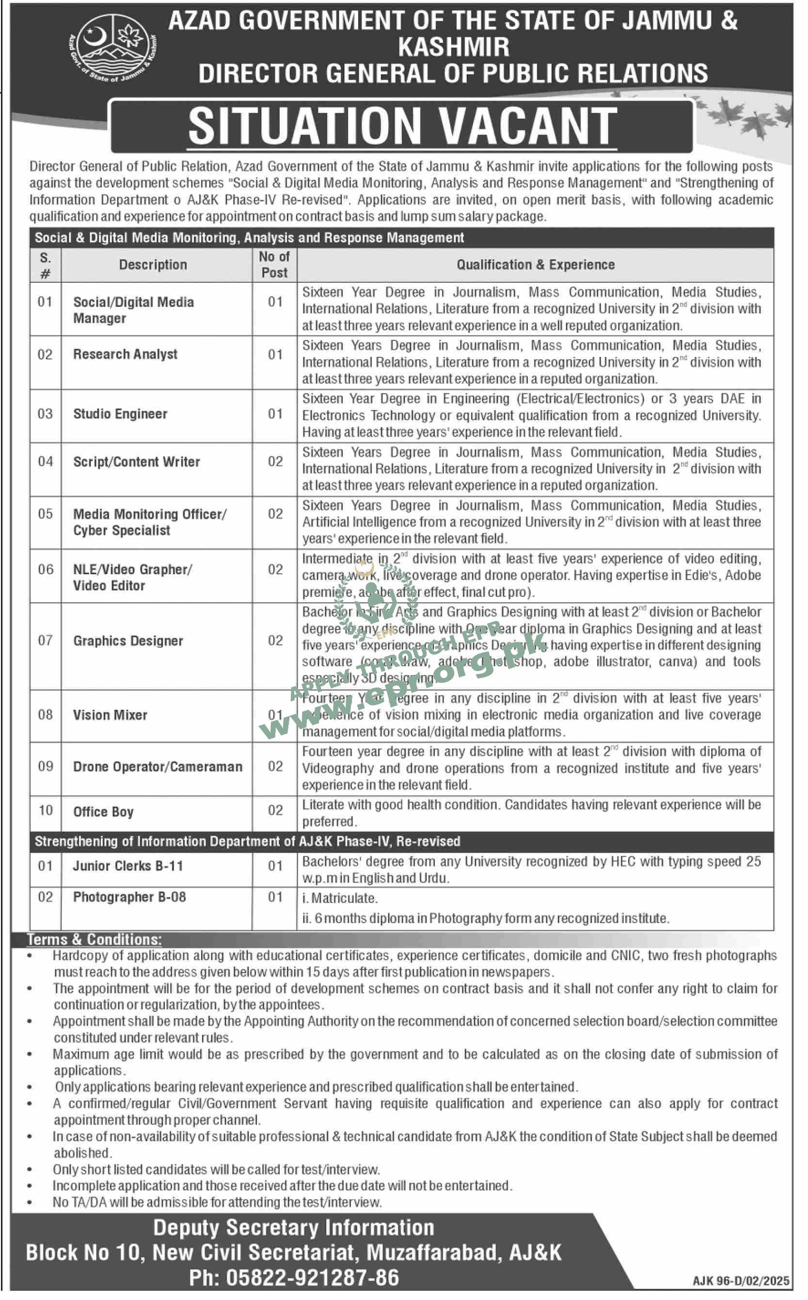 Sixteen Years Degree in Journalism, Mass Communication, Media Studies, International Relations, Literature from a recognized University in 2 division with at least three years relevant experience in a reputed organization.