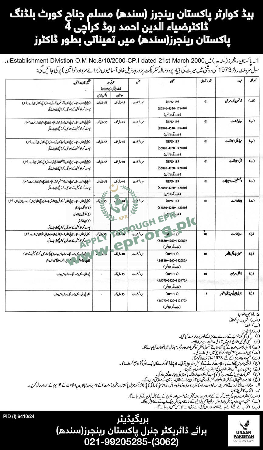Govt. Dept : PAKISTAN RANGERS HEADQUARTERS KARACHI (SINDH)