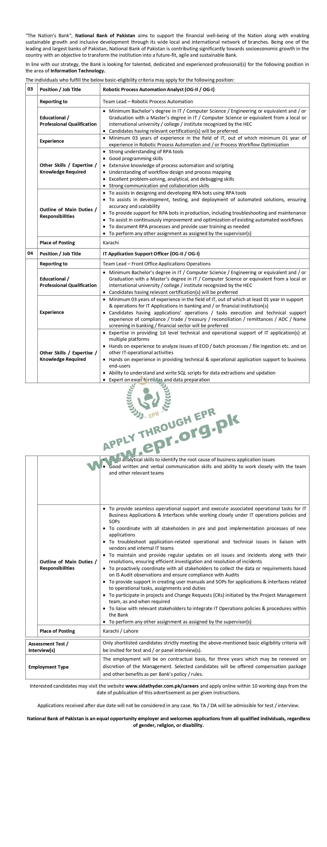 Minimum Bachelor’s degree in IT / Computer Science / Engineering or equivalent and / or Graduation with a Master’s degree in IT / Computer Science or equivalent from a local or international university / college / institute recognized by the HEC Candidates having relevant certification(s) will be preferred Experience Minimum 03 years of experience in the field of IT, out of which at least 01 year in support & operations for IT Applications in banking and / or financial institution(s) Candidates having applications’ operations / tasks execution and technical support experience of compliance / trade / treasury / reconciliation / remittances / ADC / Name screening in banking / financial sector will be preferred