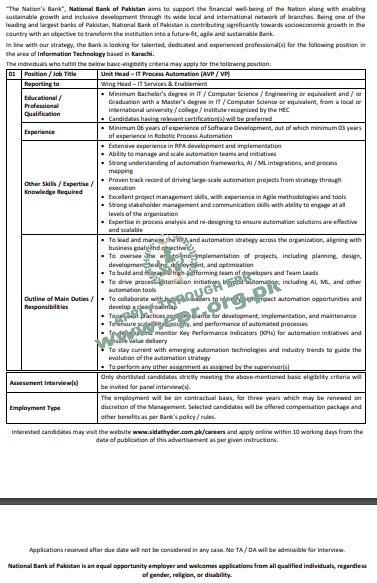 Minimum Bachelor’s degree in IT / Computer Science / Engineering or equivalent and / or Graduation with a Master’s degree in IT / Computer Science or equivalent, from a local or international university / college / institute recognized by the HEC Candidates having relevant certification(s) will be preferred Experience Minimum 06 years of experience of Software Development, out of which minimum 03 years of experience in Robotic Process Automation