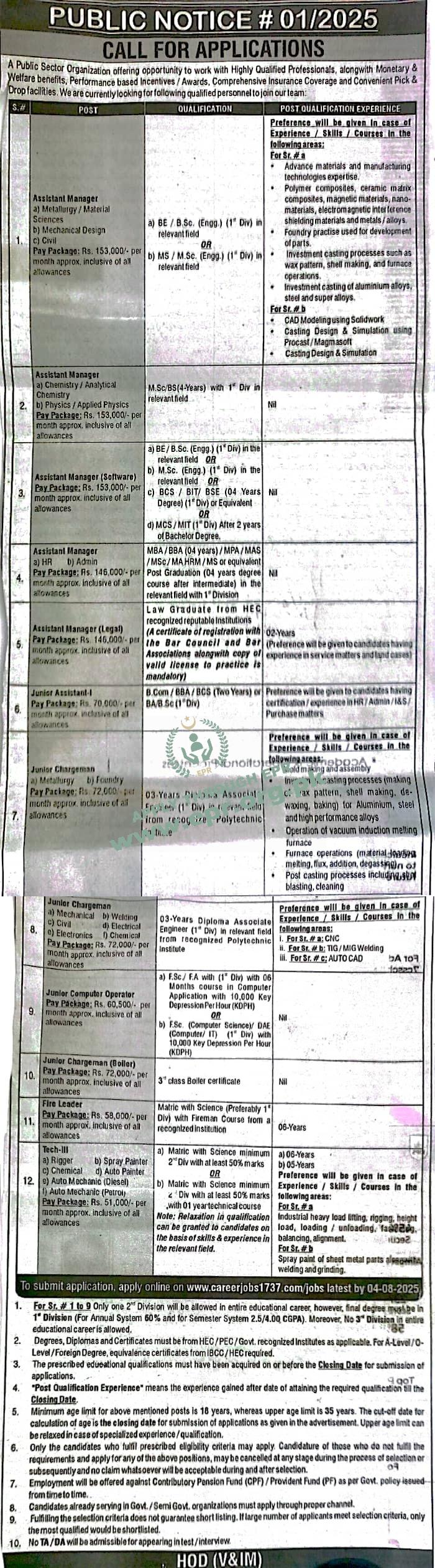 03 years Diploma Associate Engineering (1st Div) in relevant field from recognized Polytechnic Institution.