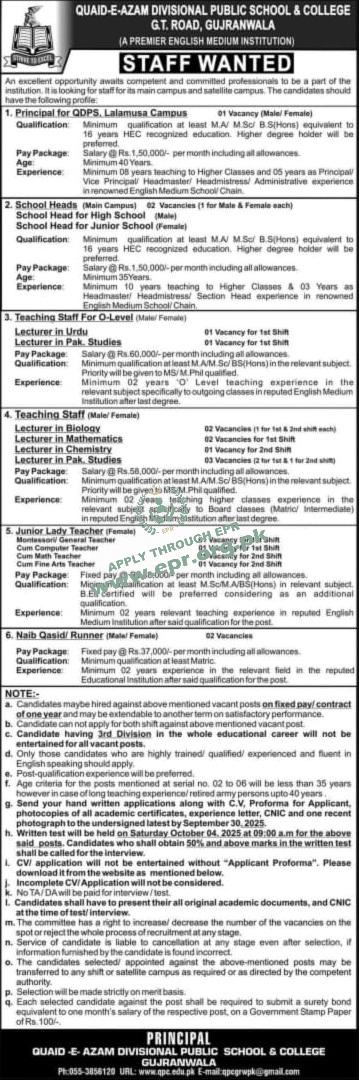 Minimum 10 years teaching to Higher Classes & 03 Years as Headmaster Headmistress/ Section Head experience in renowned English Medium School/ Chain
