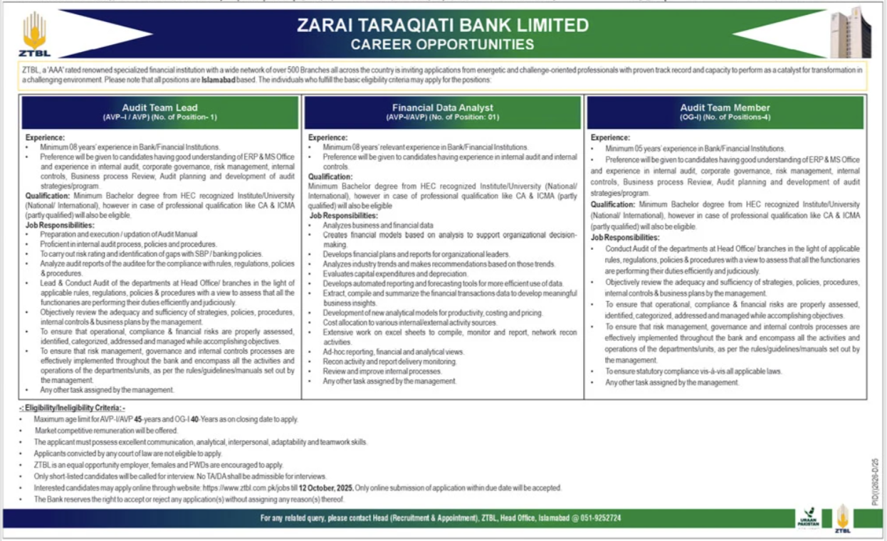 Minimum 08 years’ relevant experience in Bank/Financial Institutions. Preference will be given to candidates having experience in internal audit and internal controls.