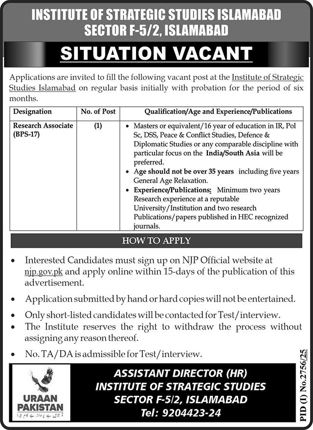 Masters or equivalent/16 year of education in IR, Pol Sc, DSS, Peace & Conflict Studies, Defence & Diplomatic Studies or any comparable discipline with particular focus on the India/South Asia will be preferred. Experience/Publication: -Minimum two years Research experience at a reputable University/Institution and two research Publications/papers published in HEC recognized journals.