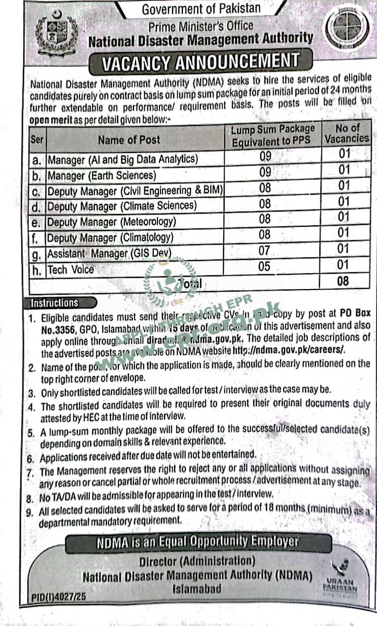 • Master’s/ Bachelor’s Degree (16 years of Education) in Remote Sensing, Meteorology, Environmental Science, Geoscience, Environmental Physics or any other relevant field from HEC recognized institutions. Up to 2 years relevant professional experience shall be preferred. Fresh candidates may also apply.