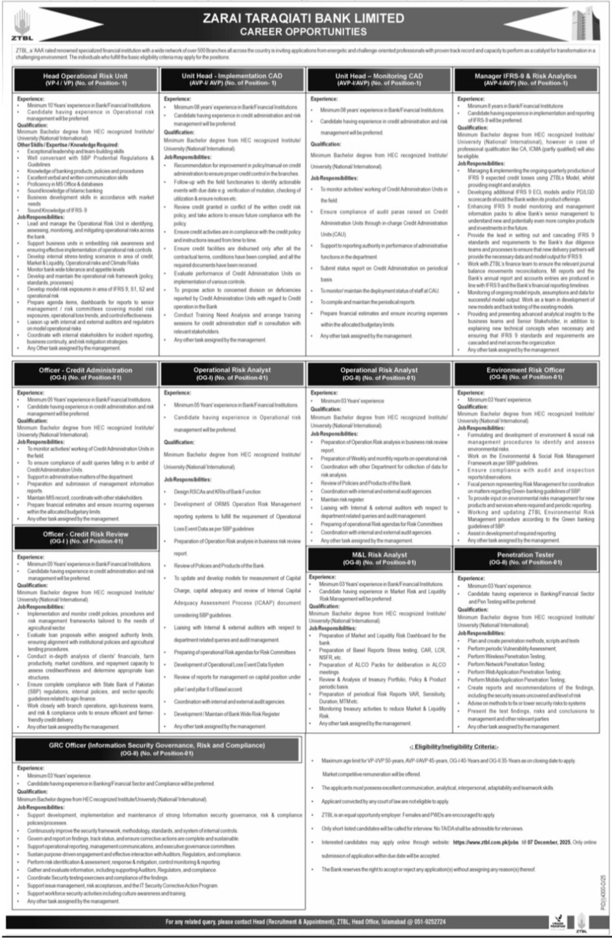 Minimum Bachelor degree from HEC recognized Institute/University (National/ International). Minimum 10 Years’ experience in Bank/Financial Institutions. Candidate having experience in Operational risk management will be preferred