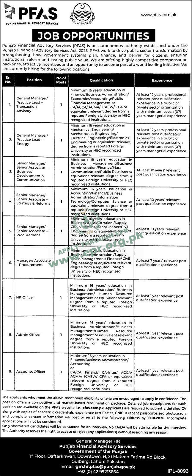 Govt. Dept : Punjab Financial Advisory Services