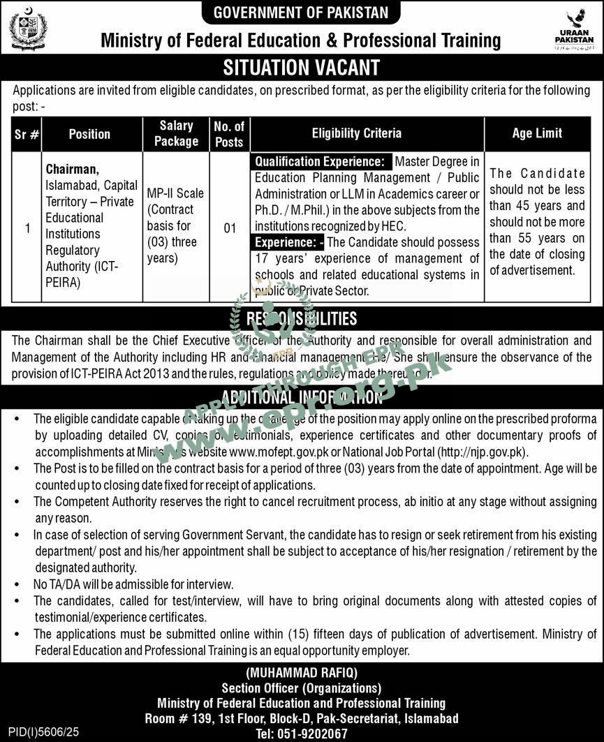 Govt. Dept : Ministry of Federal Education & Professional Training (FE&PT)