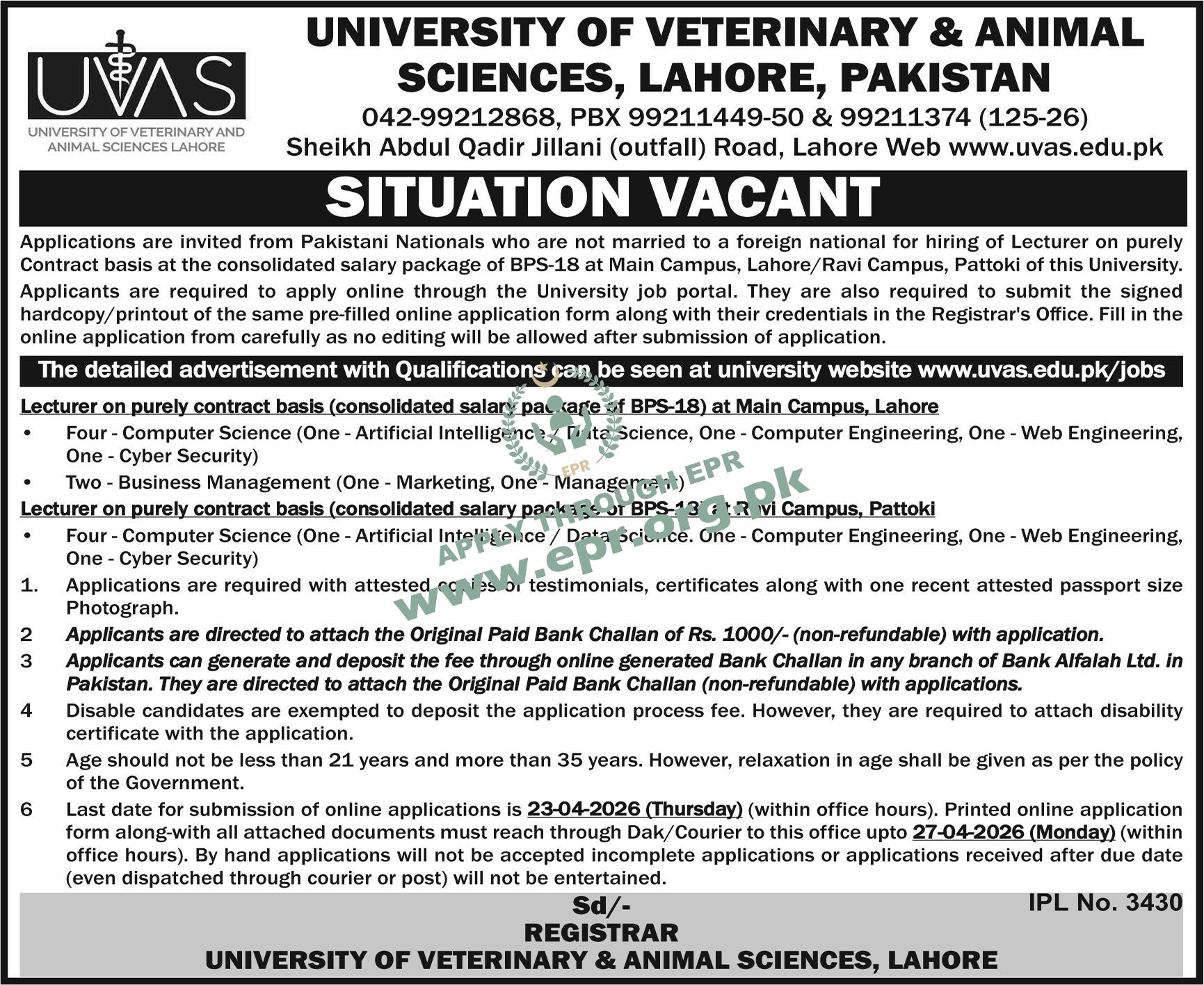 Govt. Dept : University of Veterinary & Animal Sciences (UVAS), Lahore