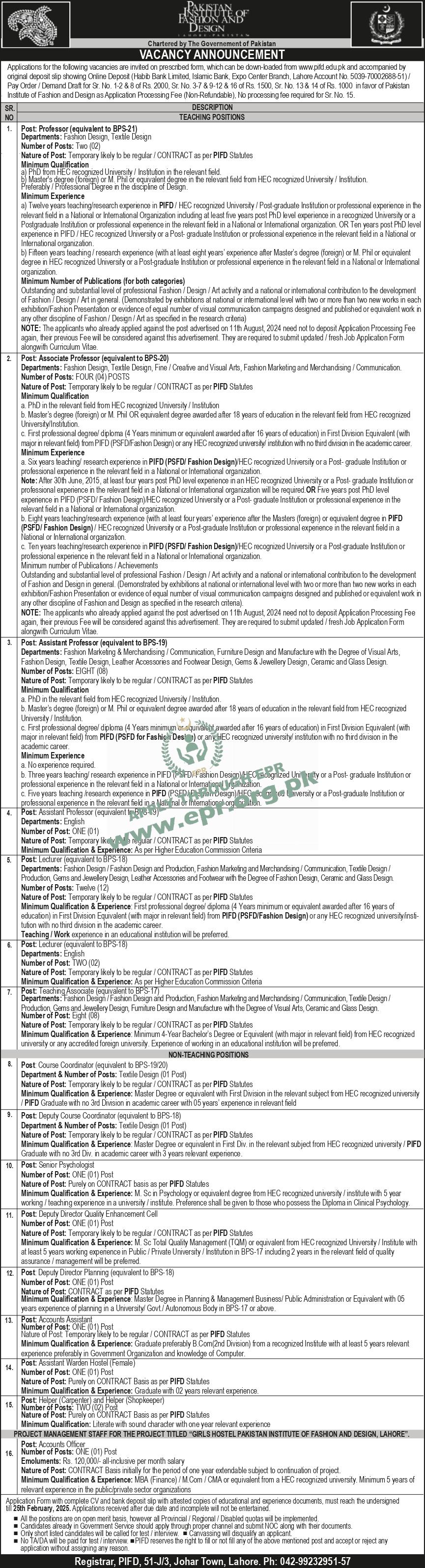 Master Degree or equivalent with First Division in the relevant subject from HEC recognized university / PIFD Graduate with no 3rd Division in academic career with 05 years’ experience in relevant field
