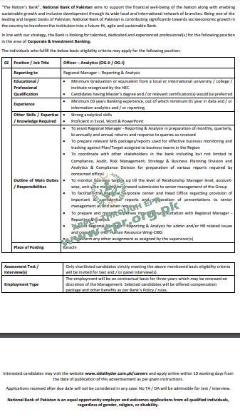 Minimum Graduation or equivalent from a local or international university / college / institute recognized by the HEC • Candidates having Master's degree and / or relevant certification(s) would be preferred Experience • Minimum 03 years Banking experience, out of which minimum 01 year in data and / or information analytics and / or reporting