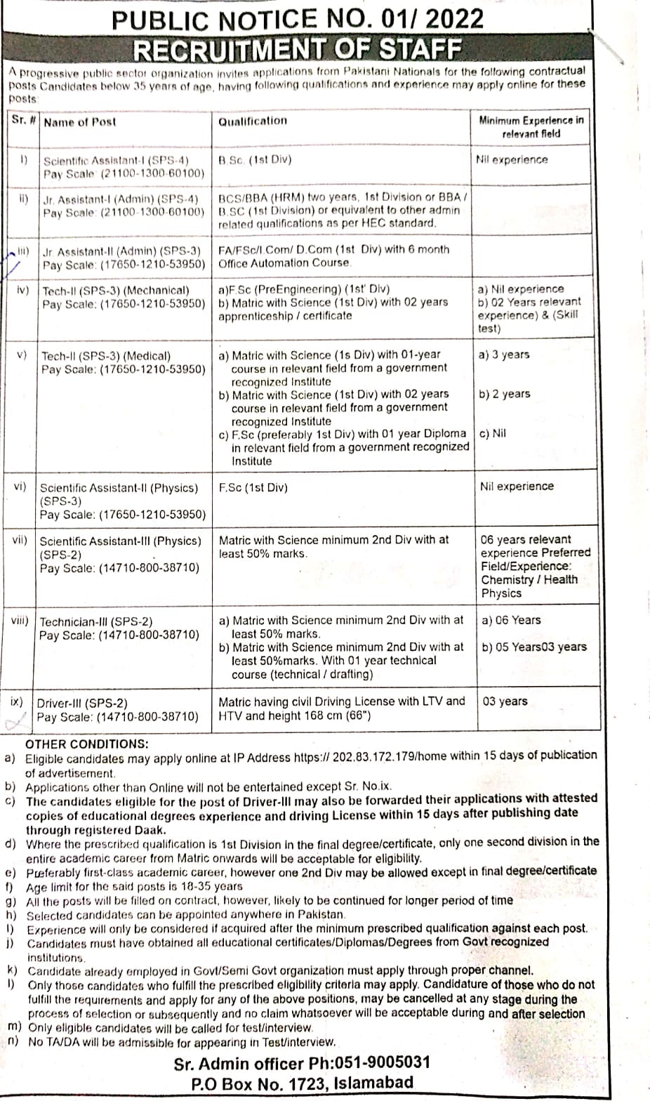BCS/BBA (HRM) two years, 1st division or BBA/B.SC (1st division) or equivalent to other admin related qualifications as per HEC standard.