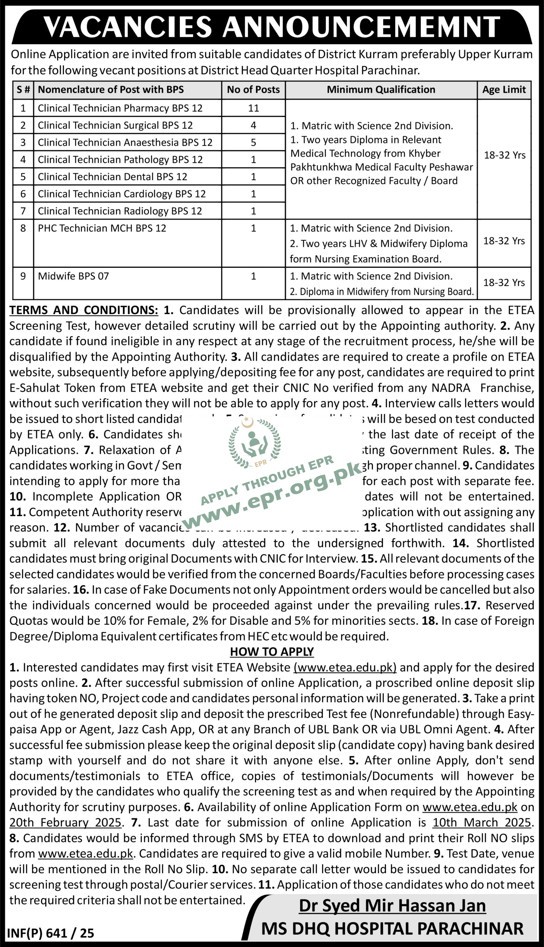 Matric with Science 2nd Division and Two years Diploma in Relevant Medical Technology from Khyber Pakhtunkhwa Medical Faculty Peshawar OR other Recognized Faculty / Board
