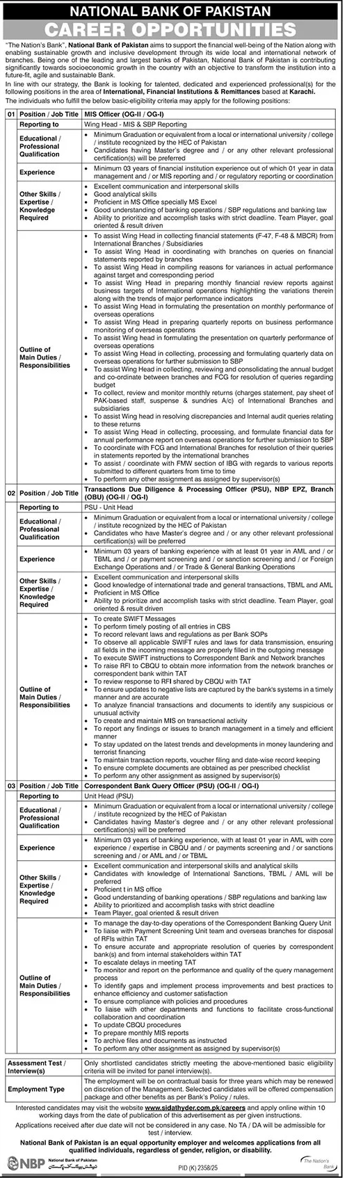 Transactions Due Diligence & Processing Officer (PSU), NBP EPZ, Branch (OBU)