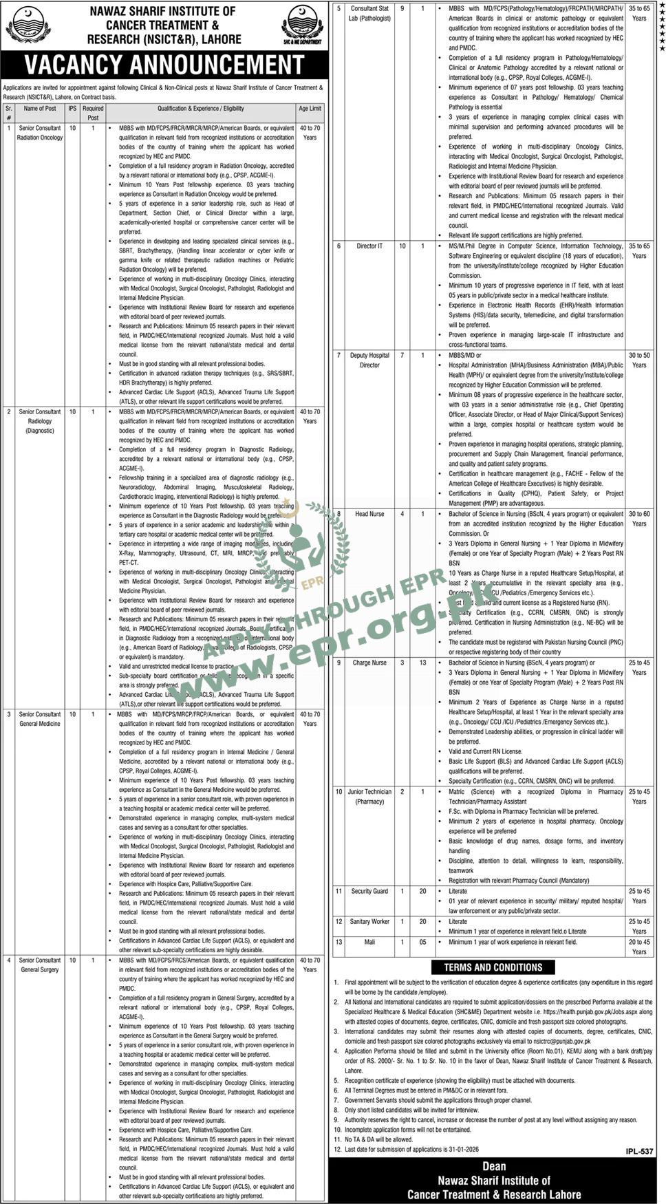 Govt. Dept : NAWAZ SHARIF INSTITUTE OF CANCER TREATMENT & RESEARCH (NSICT&R)