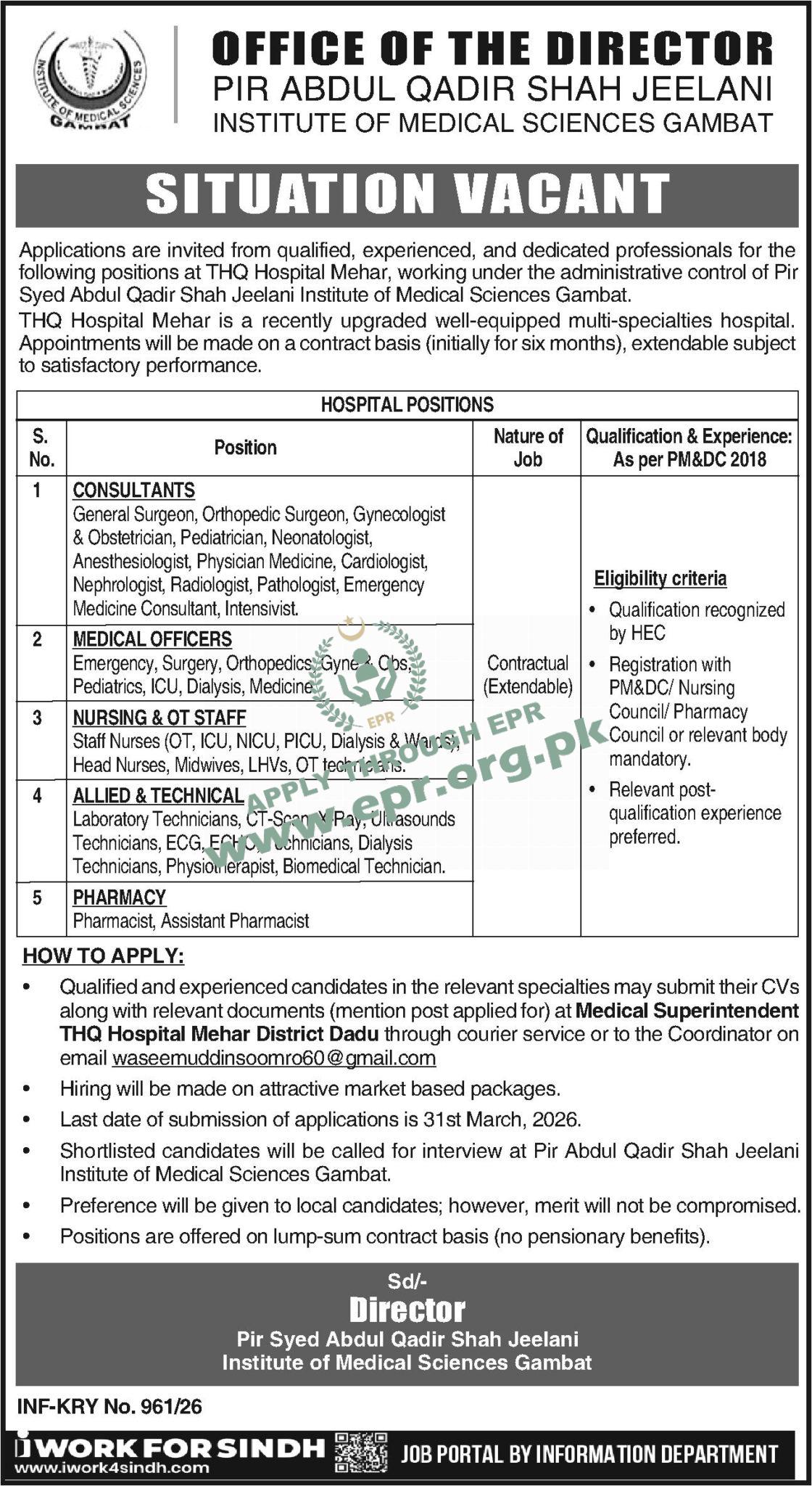 Govt. Dept : Pir Syed Abdul Qadir Shah Gillani Institute of Medical Sciences, Gambat