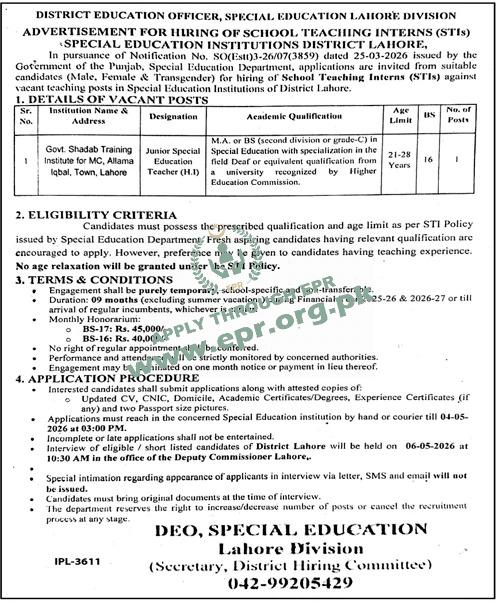 Junior Special Education Teacher (H.I) For (Govt Shadab Training Institute)