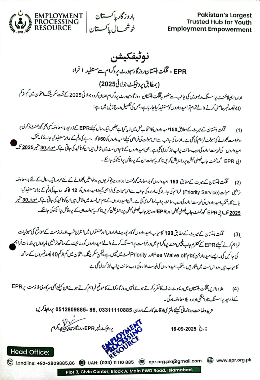 4 | NOTIFICATION: Gilgit Baltistan Rozgaar Support Program Beneficiaries (Project July 2025) | View Attached Document |